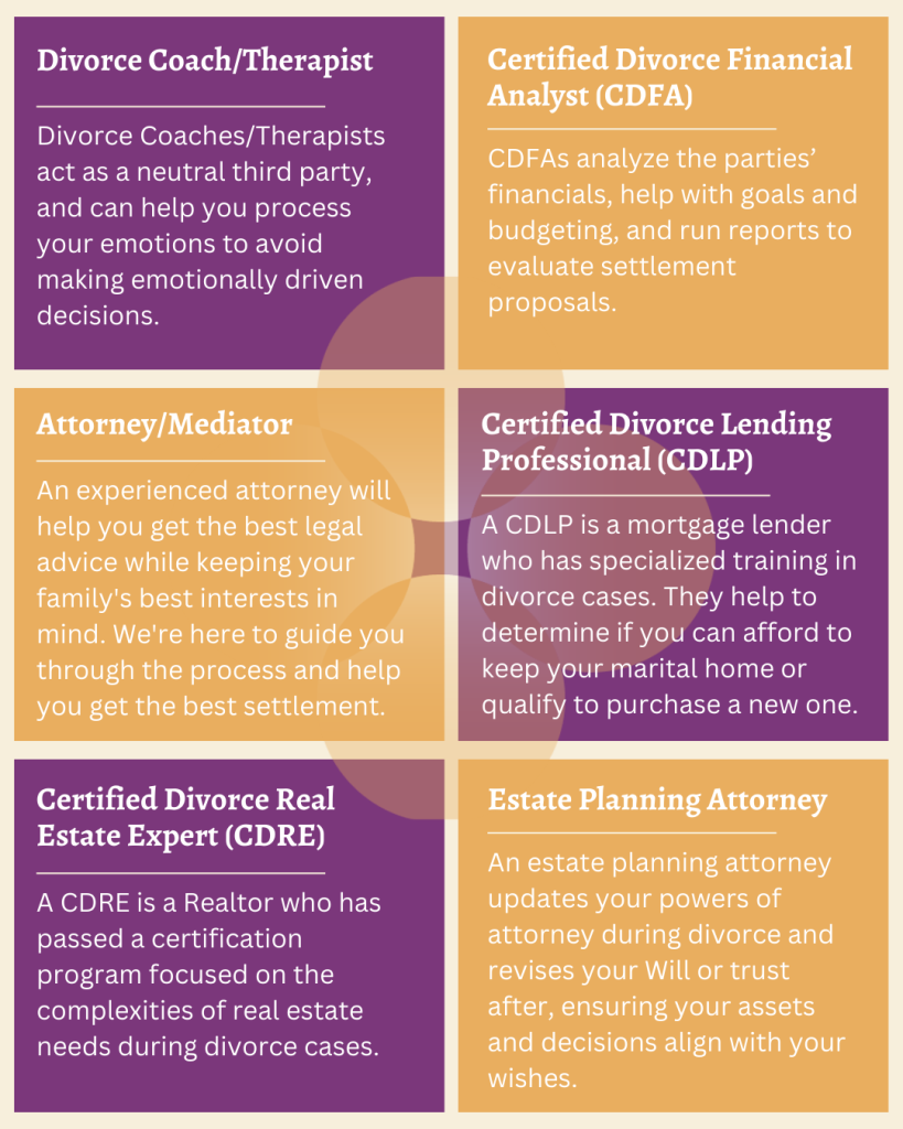 If you’re considering divorce, you may have already turned to a therapist to help navigate the emotional complexities of that decision. That’s a great start! While friends and family can also be supportive, they likely carry their own biases. That’s why having a neutral third party, such as a therapist or divorce coach, is essential. These divorce professionals can help you process your emotions and regulate your nervous system to avoid making emotionally driven decisions, which can prolong the divorce process and increase costs.
